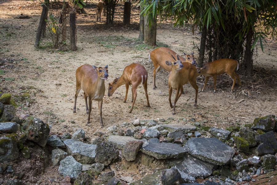 သွင်ပြင်လက္ခဏာ - အထီးများတွင် ဦးချိုပါရှိပြီး ဦးချိုသည်တိုပါသည်။ အမများတွင် ဦးချိုမပါရှိပါ။ အထီးများ တွင် ချွန်ထက်သောအစွယ်ပါရှိပြီး တိုက်ခိုက်ရာတွင် အသုံးပြုပါသည်။ အရောင်မှာ နီညို ရောင်ဖြစ်ပြီး မျက်ခုံးမွှေးများမှာ သိသာထင်ရှားပါသည်။